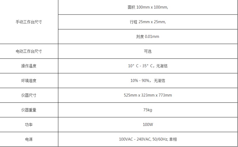 手動(dòng)X-Y工作臺(tái):表面積 100mm x 100mm,行程 25mm x 25mm;