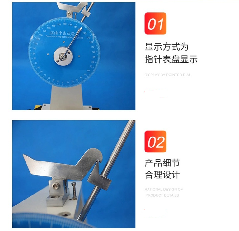 塑膠材料之試片,受到一定角度,一定重量之打擊后,所能吸收之能量,以判定材料之韌性。本機是一種結構簡單、造型美觀、操作方便、數據準確的檢測儀器。 顯示方式分為,指針表盤顯示。產品符合ISO179、180、GB/T1043、1843、ASTM D256、JB8762、JB8761、ISO9854、GB18743等標準的要求。