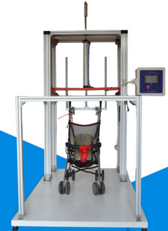 本機適用于手推式嬰兒車模擬超越障礙物時所作舉起下壓耐用性測試,測試方法為置模型嬰兒于車臺中,舉起時使車臺后輪離地區(qū)150mm,下壓時使車臺前輪離地150mm,以每分鐘15±1次,并持續(xù)往復測試3000次后,目視車臺有無損壞,達設定次數(shù),并能自動停止操作。